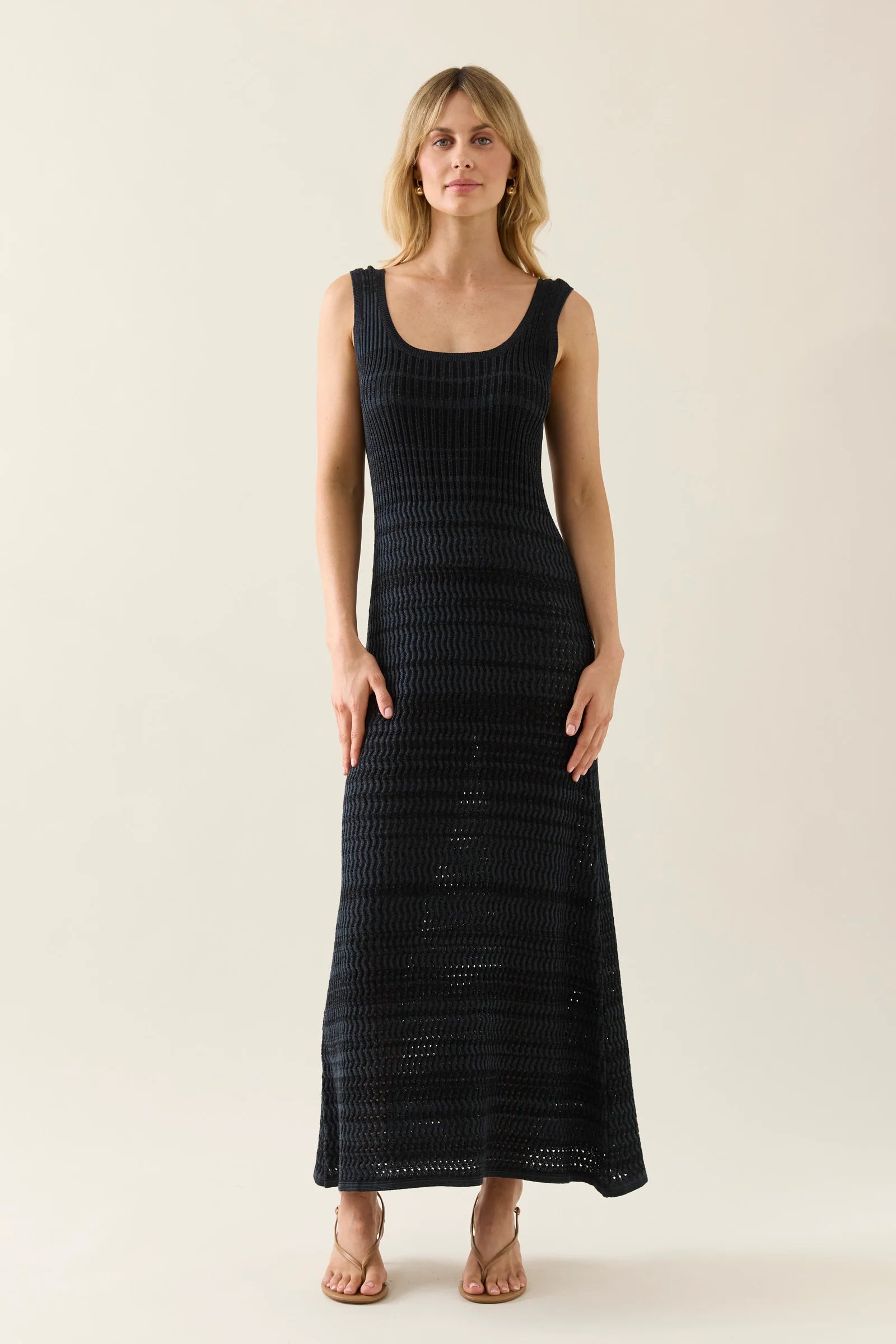 A textural pointelle-knit dress crafted from 100% cotton. This 7/8-length dress features mixed two-tone woven fibres for visual depth, a rounded neckline, and a softly flared mermaid-style hem. This dress offers subtle glimpses of skin.