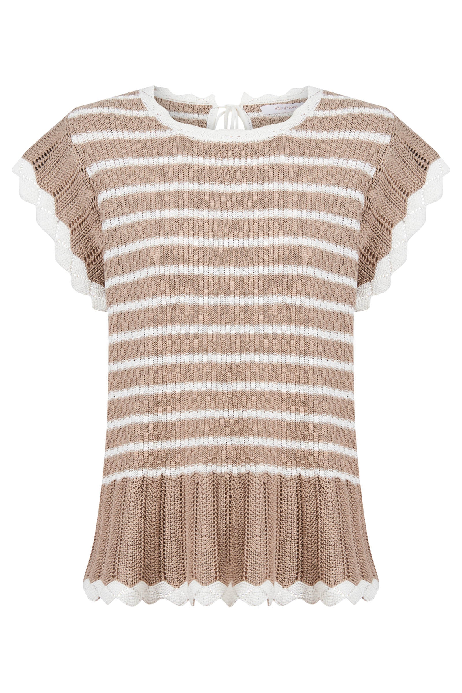 A lightweight knit crafted from 100% cotton with pointelle texture and fine horizontal stripe detail. The relaxed fit features scallop edging at the sleeves, hem, and neckline, finished with a back keyhole and tie detail.