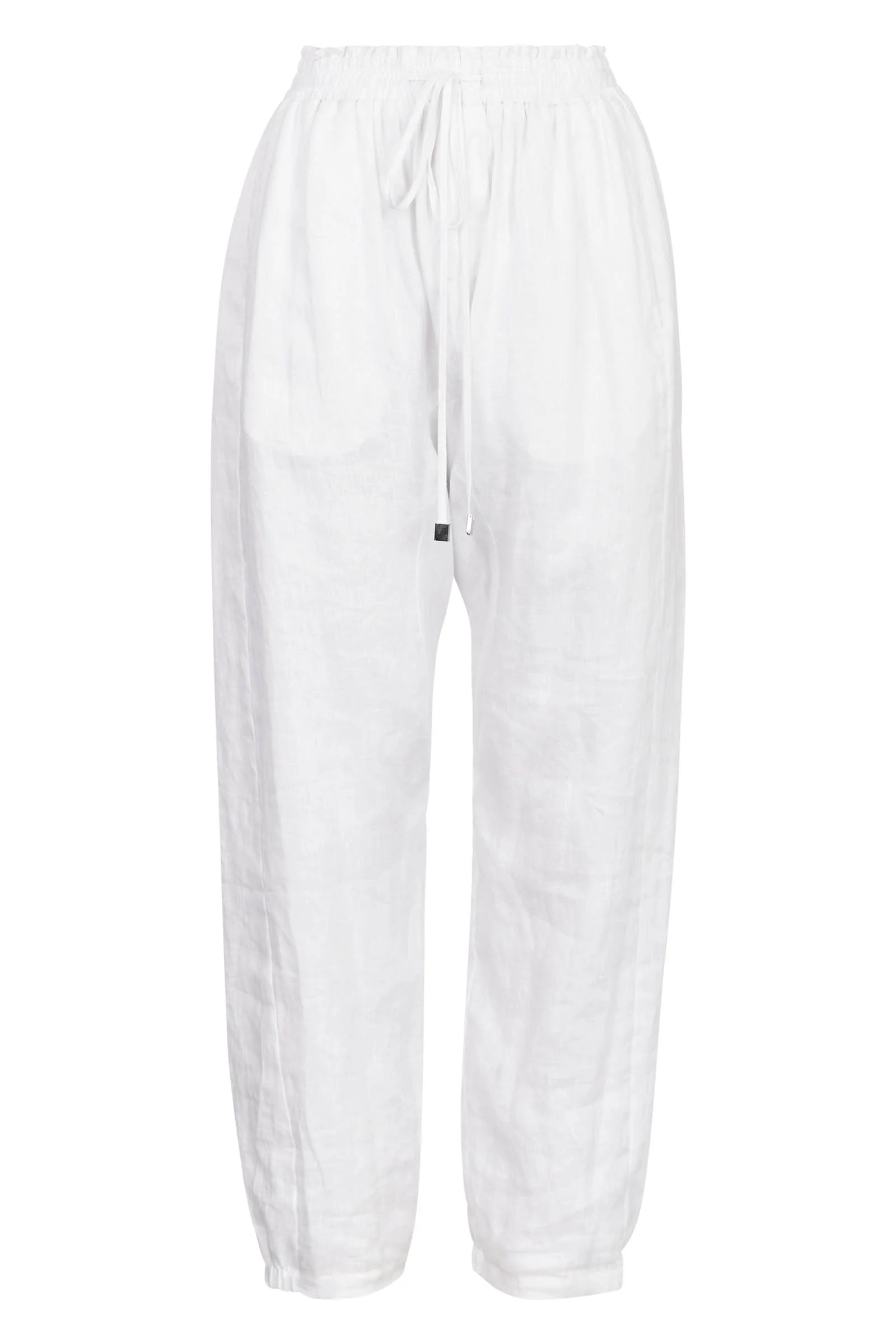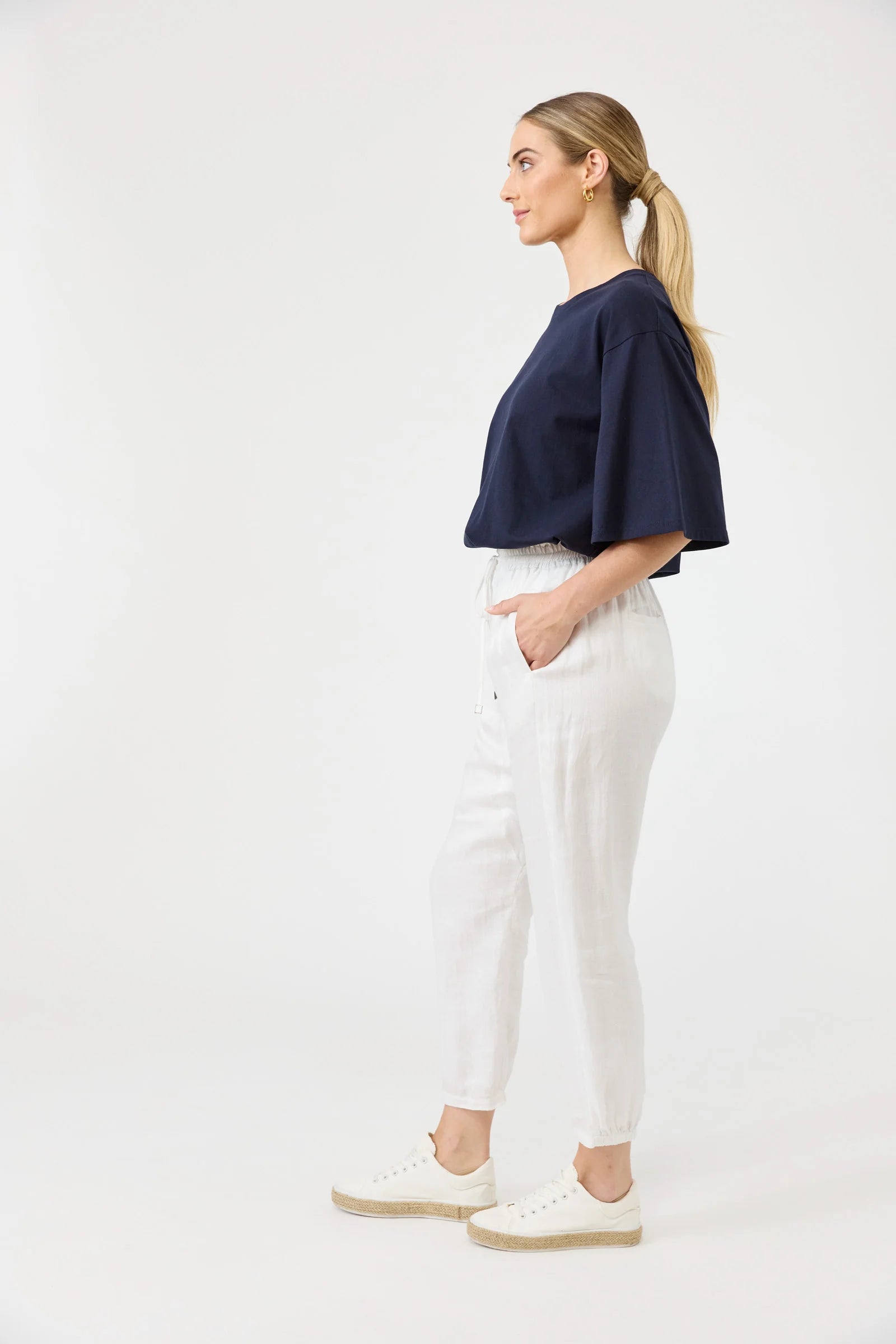 A casual essential designed for all-day comfort. Relaxed jogger silhouette with a slight drop crotch, tapered leg and elastic at the back of the cuff for subtle shape. Featuring a drawstring elasticated waist for a flexible fit. Crafted from 100% linen for breathable ease.