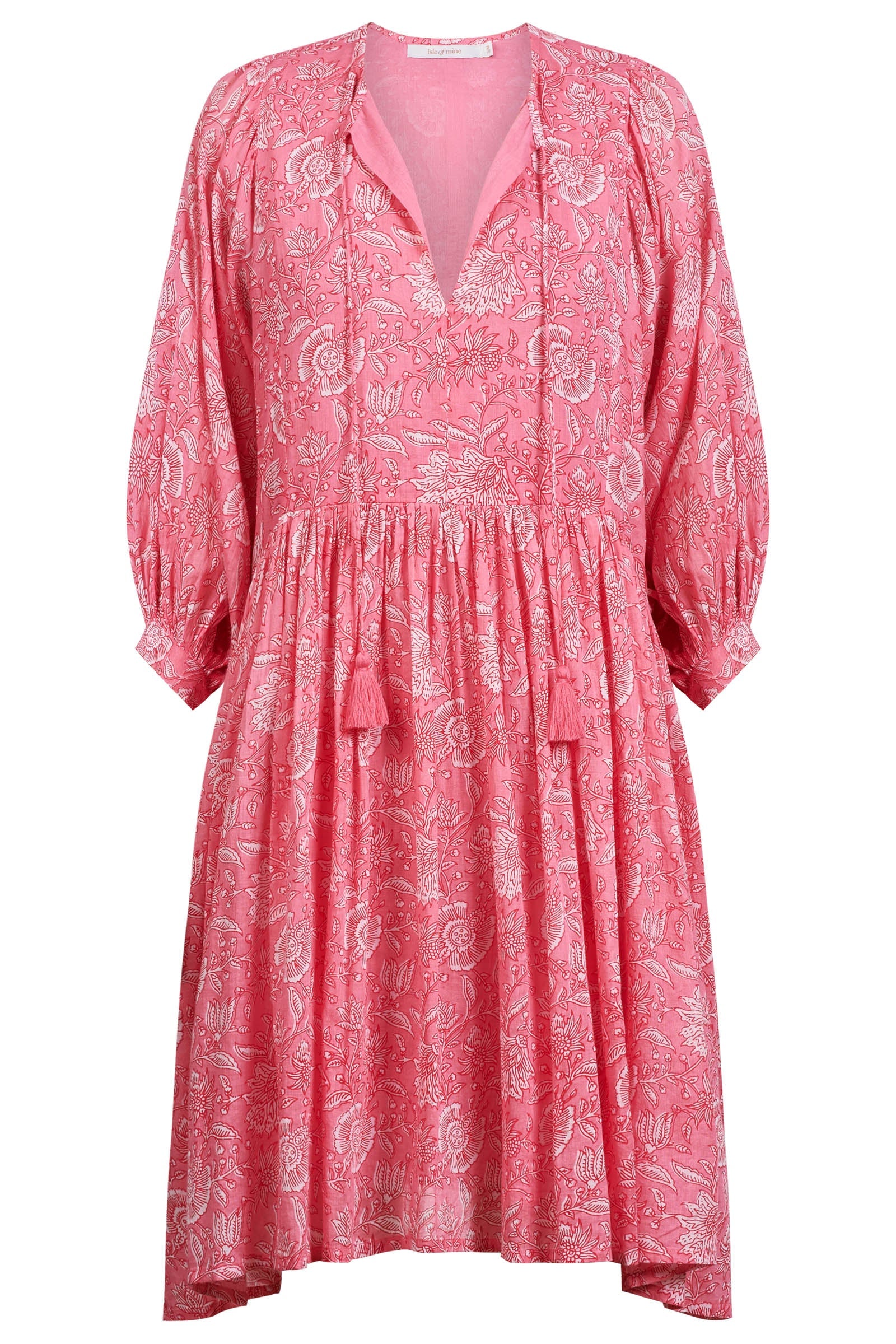 The Wilma Dress is crafted from lightweight cotton voile, hand screen printed for a one-of-a-kind look. Inspired by floral hand-block, and featuring a V-neckline with tassel ties, a gathered waist, 3/4 sleeves. Fully lined for comfort and ready to wear.